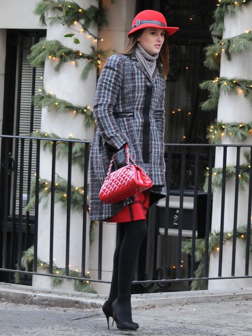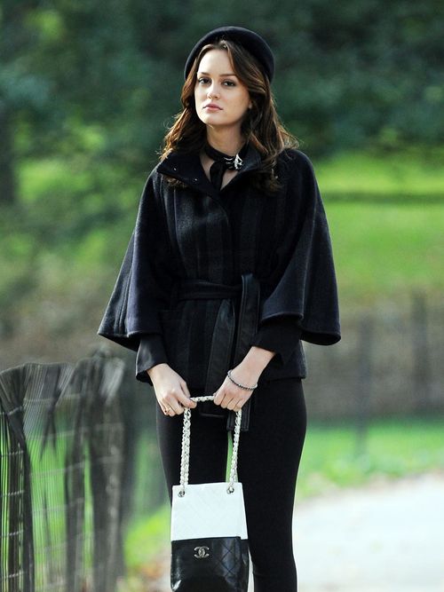 Nella lunga scalata al titolo di Queen B alla NYU (correva l'episodio 10 della terza stagione) Blair sfoggia un elegante outfit composto da un cappotto di Theory, leggings di Vince e cappello di Ralph Lauren.