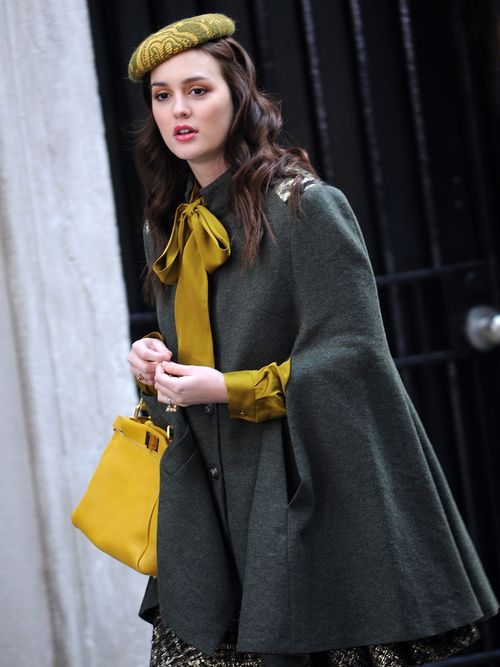 Correva la stagione n°5 e Blair sfoggiava questo outfit bon ton composto da una mantella di Gryphon, un top firmato Diane von Furstenberg, una gonna di Alice + Olivia, scarpe Miu Miu e Fendi bag.