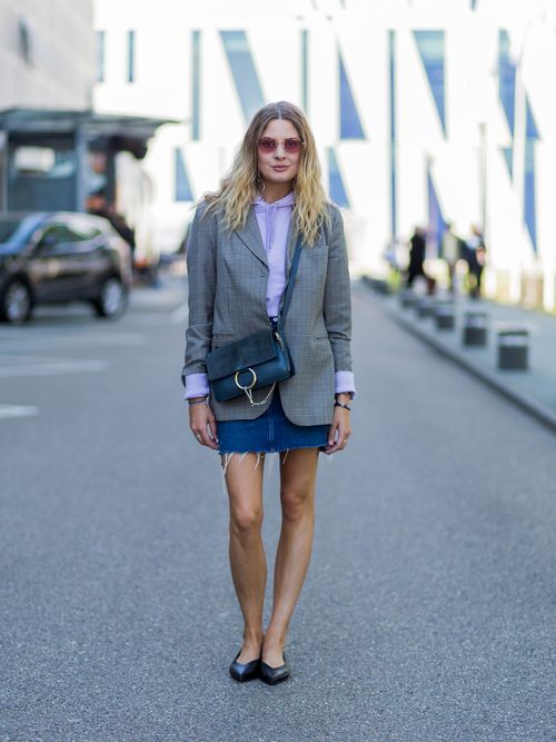 Bastano una minigonna in denim, una felpa colorata e un paio di ballerine a punta per rendere femminile la giacca più maschile che ci sia e creare un daily look casual ma ricercato. Provare per credere!