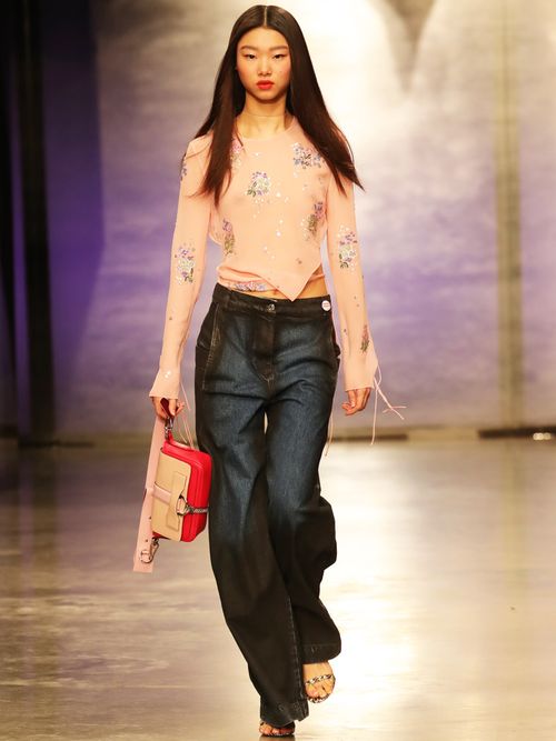 ...mentre da Topshop Unique i jeans si indossano con i sandali a listini sottili e preferiscono di gran lunga il delavè. Una nota underground per i maxi pants che, a ben vedere, hanno anch'essi tasche da lavoro laterali.