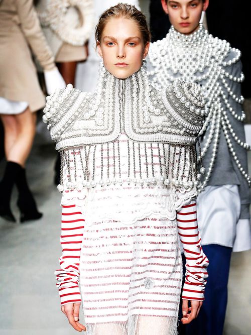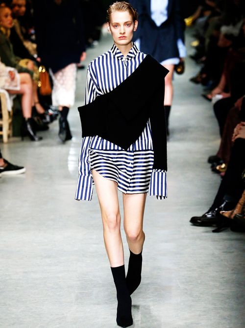 Sulla passerella di Burberry sono comparse moltissime casacche e camicie in seta e cotone nelle classiche righe breton, impreziosite da abbinamenti inaspettati con cappe di perle e maglia...