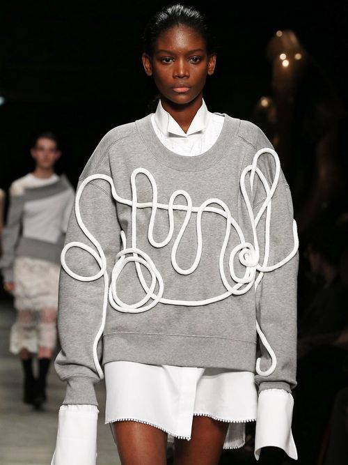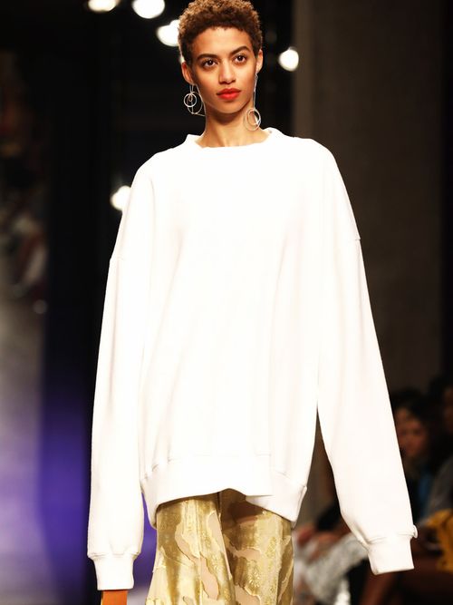 Sulla passerella di Burberry sfilano felpe oversize che sembrano opere d'arte (l'intera collezione è ispirata alle sculture dell'artista britannico Henry Moore) e si indossano sulla maxi shirt...