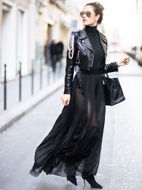 La modella americana sfoggia il proprio bodysuit trasparente (tra i più hot di stagione) direttamente sull'intimo. Il risultato è super rock, anche grazie all'abbinamento con la giacca in denim e gli striped pants.