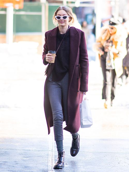 La sorella maggiore di Bella abbina con nonchalance i pantaloni alla caviglia a quadri con dei calzini morbidi a vista. Il risultato? Un look preppy chic che conquista al primo sguardo (e si adatta anche alle esigenze delle fashioniste più freddolose). Sostituisci gli anfibi con un paio di stringate basse per indossarli anche in ufficio!