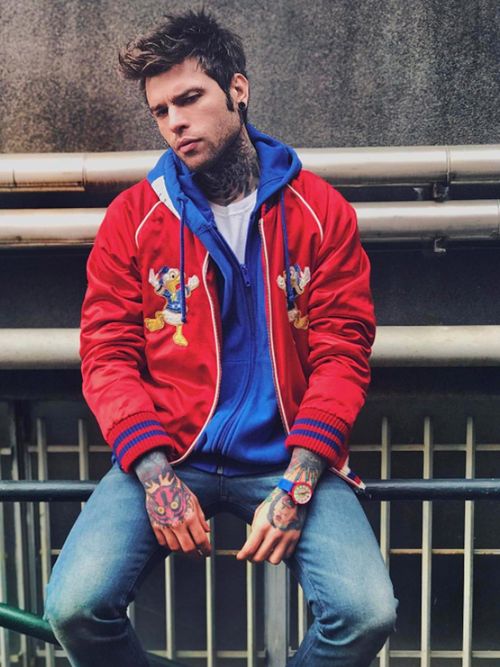Fedez sfoggia il suo nuovo bomber in satin rosso fiammante firmato Gucci e lo indossa su una felpa blu e una t-shirt bianca...
