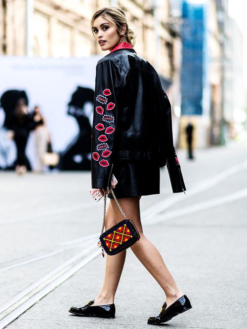 La blogger Sarah Ellen abbina alla gonna in pelle una giacca da motociclista con le toppe. La pelle non passa mai di moda e il look è d’effetto con le gambe nude quanto con le calze. Con un paio di loafer in vernice firmati Christian Louboutin i vostri piedi resteranno asciutti anche se pioviggina.