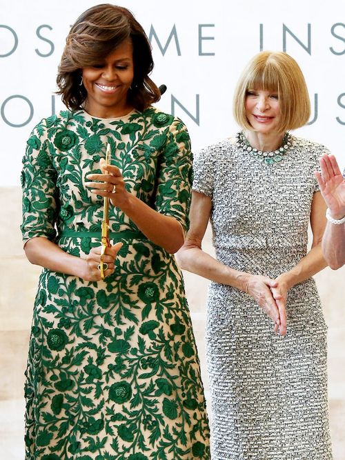 2. In occasione dell'inaugurazione del Costume Center al Metropolitan Museum of Art di New York a maggio 2014 Michelle Obama non sfigura nemmeno al fianco della regina dello stile Anna Wintour grazie a un abito in organza ricamato a fiori firmato Naeem Khan.