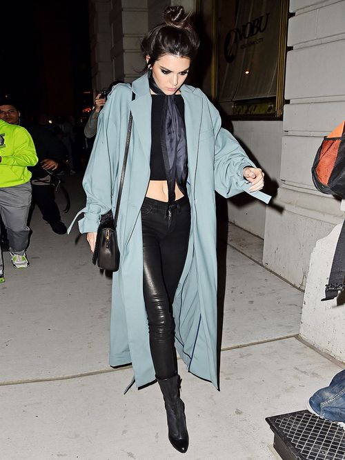 In occasione del Topshop Unique Show a febbraio Kendall ha indossato un look super cool con pantaloni azzurri, top corto e un cappotto cammello poggiato sulle spalle, che si abbinava perfettamente alle sue décolleté a punta.