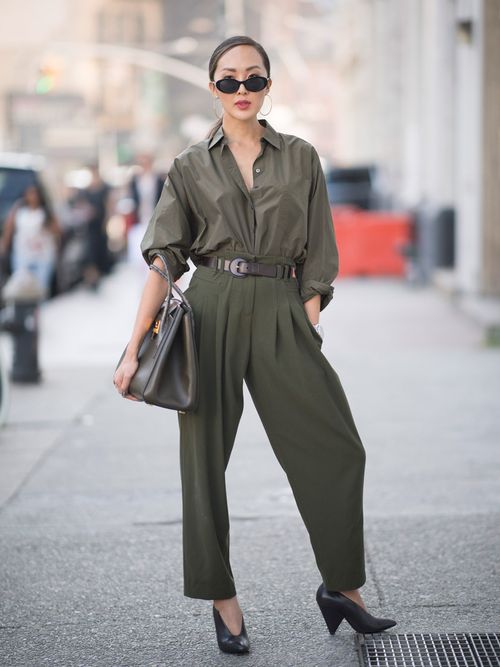 Puntare su un solo colore è un modo rapido per assemblare un look da ufficio. Scegli il khaki e le sue sfumature military per un outfit veloce, impeccabile e indolore. Camicia + pantaloni in tinta e accessori neri ti salveranno la vita... in meno di 10 minuti!