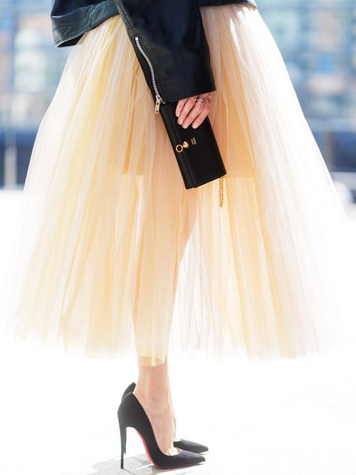 Il perfetto outfit per il weekend lungo alle porte vede protagonisti una gonna di tulle nude e un maxi chiodo di pelle. Un look rock e romantico insieme da indossare Night & Day: basta cambiare le décolleté con un paio di sneakers o di ankle boots per renderlo subito più daily.