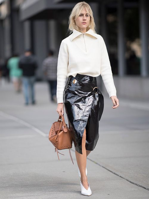 Linda Tol opta per il classico modello total white, in abbinamento a una pencil skirt di pelle vinyl.