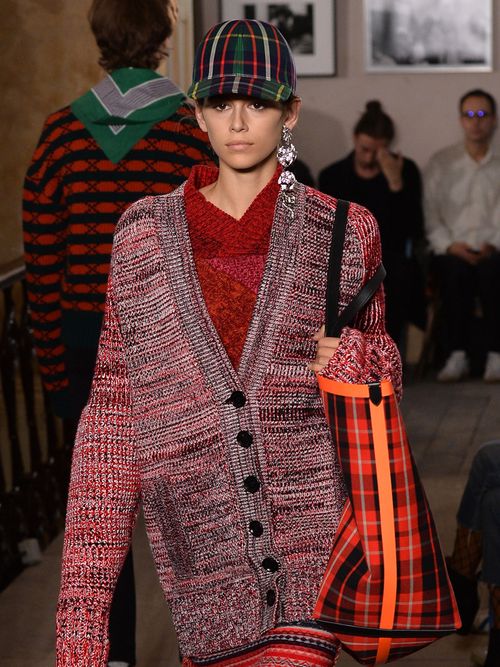 Kaia Gerber sfoggia in passerella una maxi bag e un baseball cap Tartan...