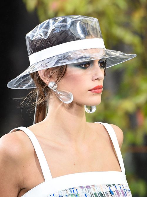 Kaia Gerber in passerella ci mostra come si indossa il cappellino in PVC con stile, ovvero con i maxi orecchini e un trucco perfetto.