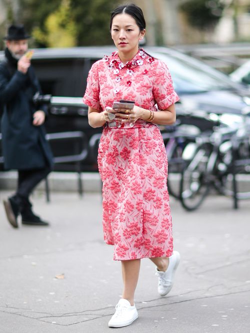 Tina Leung abbina le sue sneakers total white a un abito midi ricamato.